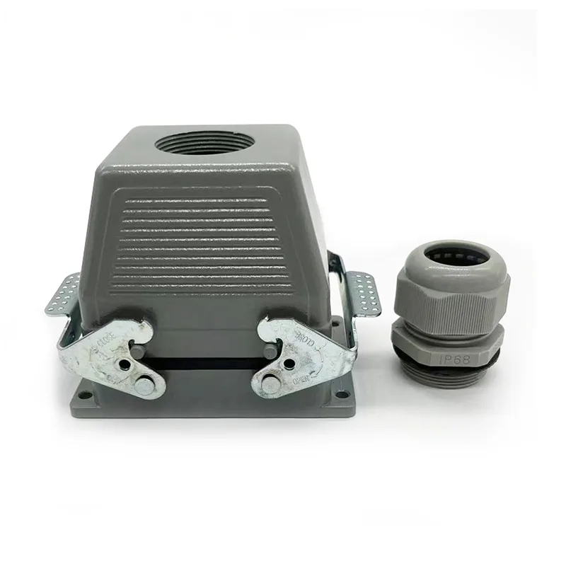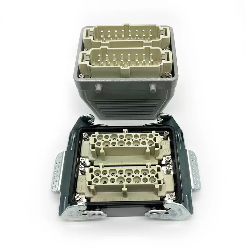I connettori per carichi pesanti TG a 32 pin sono la parte superiore dell'alloggiamento maschio. Dovrebbero essere utilizzati con parti di inserimento maschio o parti di inserimento femmina. Normalmente verrà riparato con due pezzi di HE-016-M, ma alcuni clienti speciali richiedono di assemblarlo con due pezzi di HE-016-F. Ospita anche l'HSB-016. La caratteristica di impermeabilità IP65 lo ha reso ciò che può essere utilizzato all'aperto. I connettori TG per carichi pesanti a 32 pin sono abbinati a PG29. Se i clienti hanno richieste di dimensioni diverse del pressacavo, possiamo accettare e ordinare la produzione.