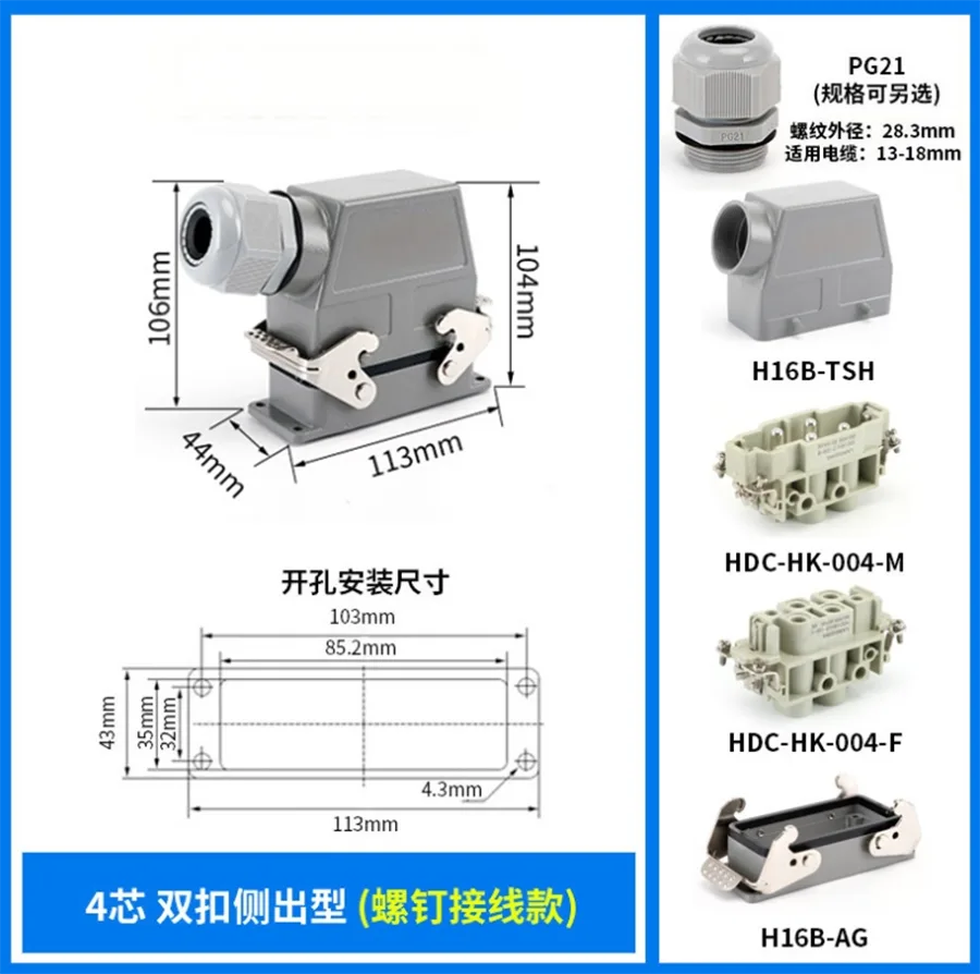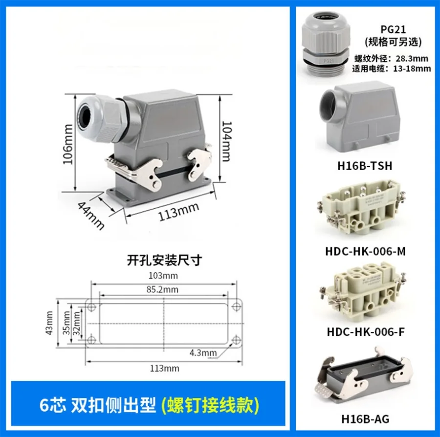 Il connettore per carichi pesanti con inserto a 4+2 pin da 80 A è realizzato con alloggiamento in alluminio H16B-TSH del connettore per carichi pesanti. È realizzato in resistente materiale PC e ottone placcato argento. I perni in ottone CHTAR sono placcati in argento, il che è di buona qualità e migliore conduttività elettrica. Contiene gomma di tenuta per renderlo una buona caratteristica impermeabile.